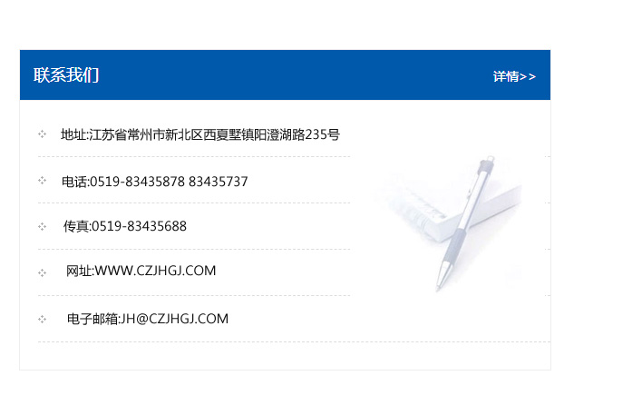 傳真:0519-83435688    郵編:213135    網(wǎng)址:WWW.czjhgj_com.komoricm.com    電子郵箱:JH@czjhgj_com.komoricm.com